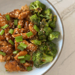7. Plate with rice, chicken, broccoli, and garnish with green onion and sesame seeds.