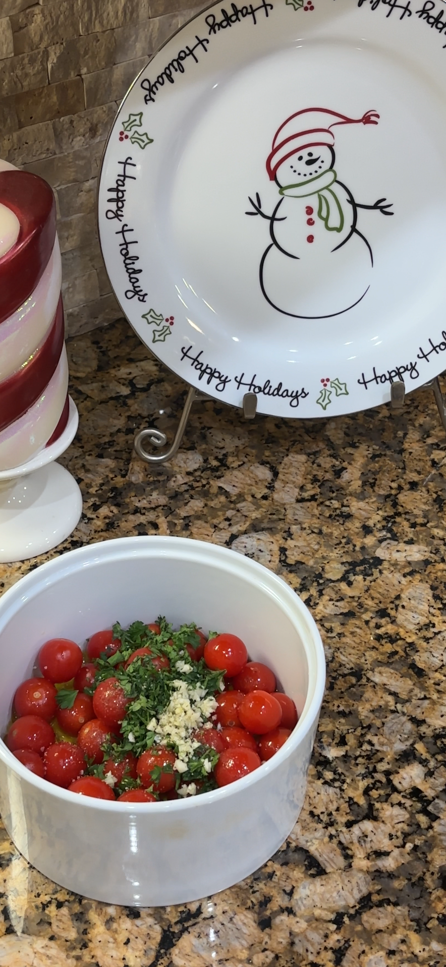 2. In a baking dish, combine the tomatoes, minced garlic, parsley, olive oil, salt, pepper, and red pepper flakes. Toss to coat everything well.