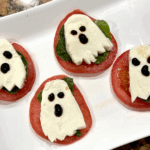 Ghost-shaped Caprese is one of those rare Halloween dishes that truly brings everyone to the table. Kids love helping place the basil leaves and assisting in layering the tomatoes with the cheese. They can even help with making spooky faces on the ghost!