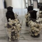 4. Allow to dry for 10 minutes. Then spoon into little cups of choice (I like small clear ones) and top each cup with a chocolate gravestone. If you want to do one large bowl, toss popcorn into bowl and then place gravestones among the top