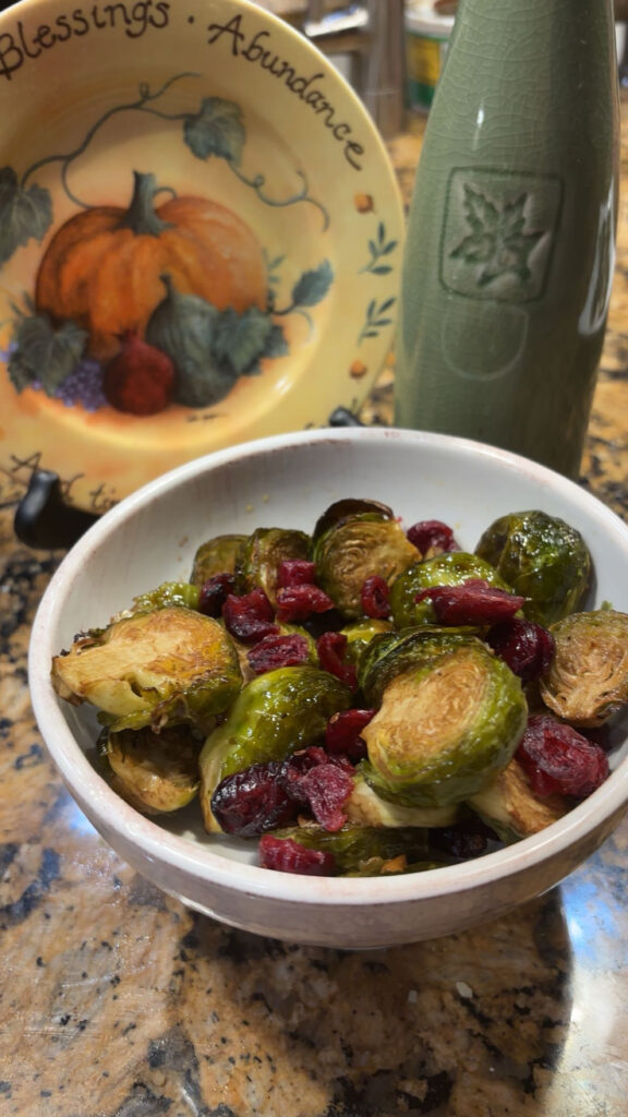 Mixing the glaze and coating the vegetables before baking, is what creates that beautiful golden coating. While baking, allow the edges to crisp and turn a nice shade of brown, as this will add flavor and give them that roasted flavor. Try not to open the oven too much, as this will allow the heat to escape, and overall making them take longer to cook. Lastly, add the cranberries a few minutes after the brussels sprouts are removed from the oven. If you put them on prior, they will get hard or difficult to chew on.