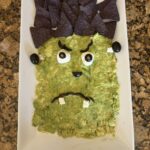 With this part, you can be as creative as you would like. I like to use mozzarella balls with cut olives for the eyes, and use olives to create other facial features. I like making the monster look angry, because we are eating him. However, you can make him look nicer by the placement of the sliced olives for the mouth. I also like placing black tortilla chips for the hair, but you can also replace these chips with black beans. The green from the guacamole is perfect for that green monster skin, so get creative with creating your monsters face!