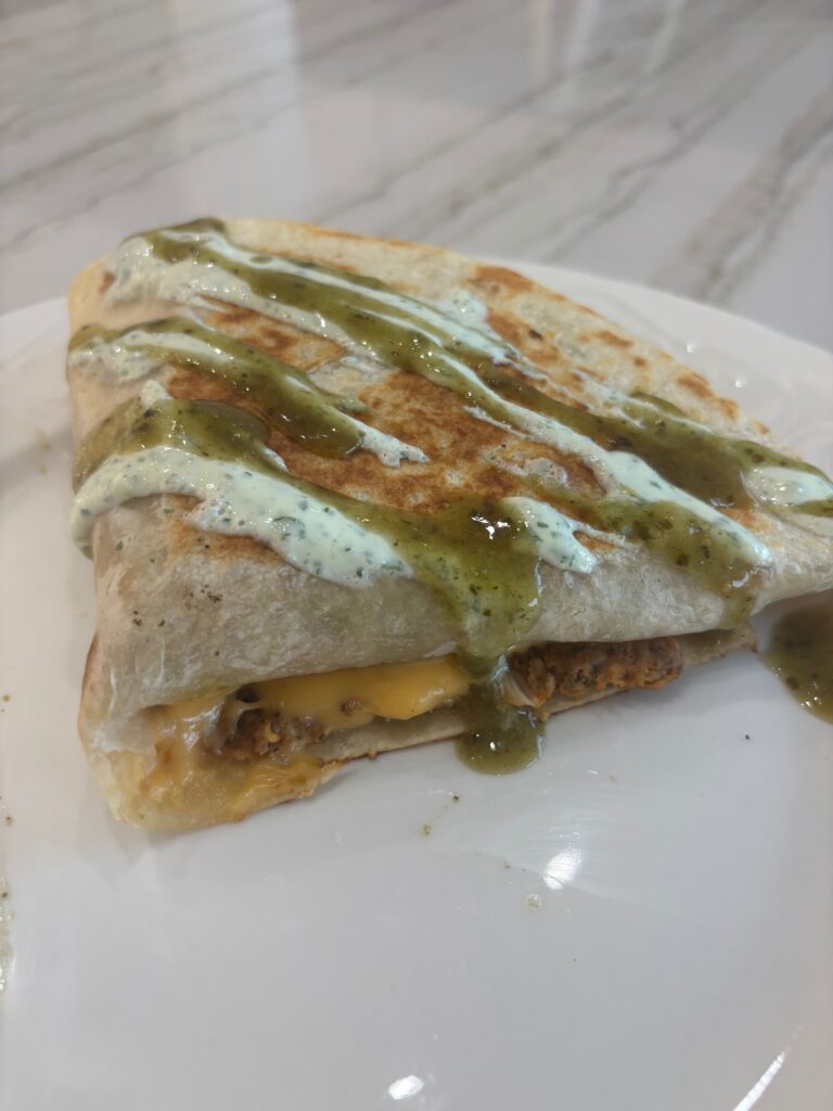 This 10-minute veggie chicken stacker features juicy chicken and a giant tortilla folded into four layers. Within these layers, I add pico de gallo, guacamole, queso, and lettuce. This meal is filling and satisfying. Also, it includes protein, some veggies, dairy, and a carb!